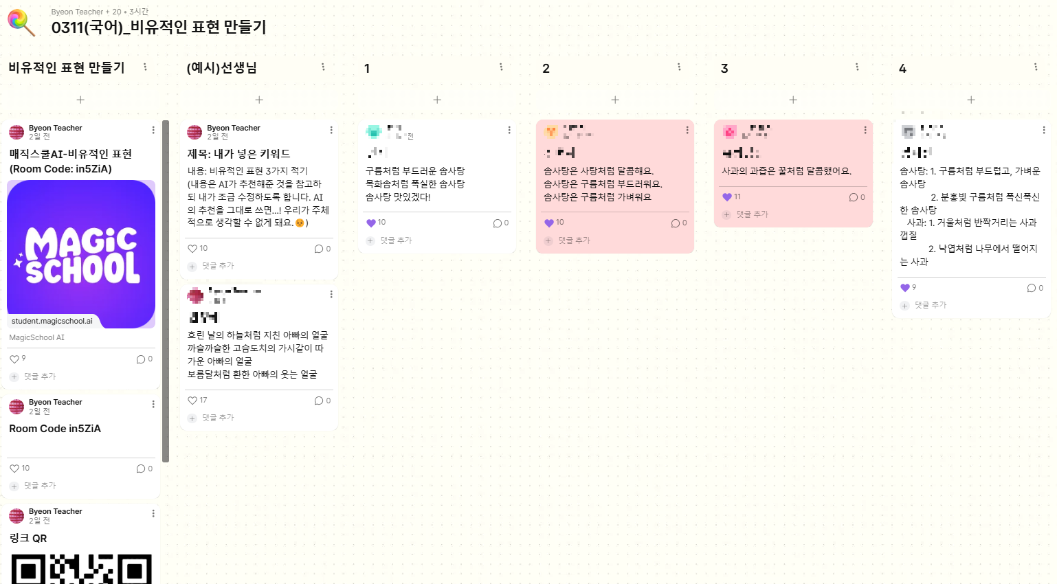 패들릿에 자신이 만들거나 AI가 만들어준 비유적인 표현 중 마음에 드는 것을 공유하도록 안내했다.