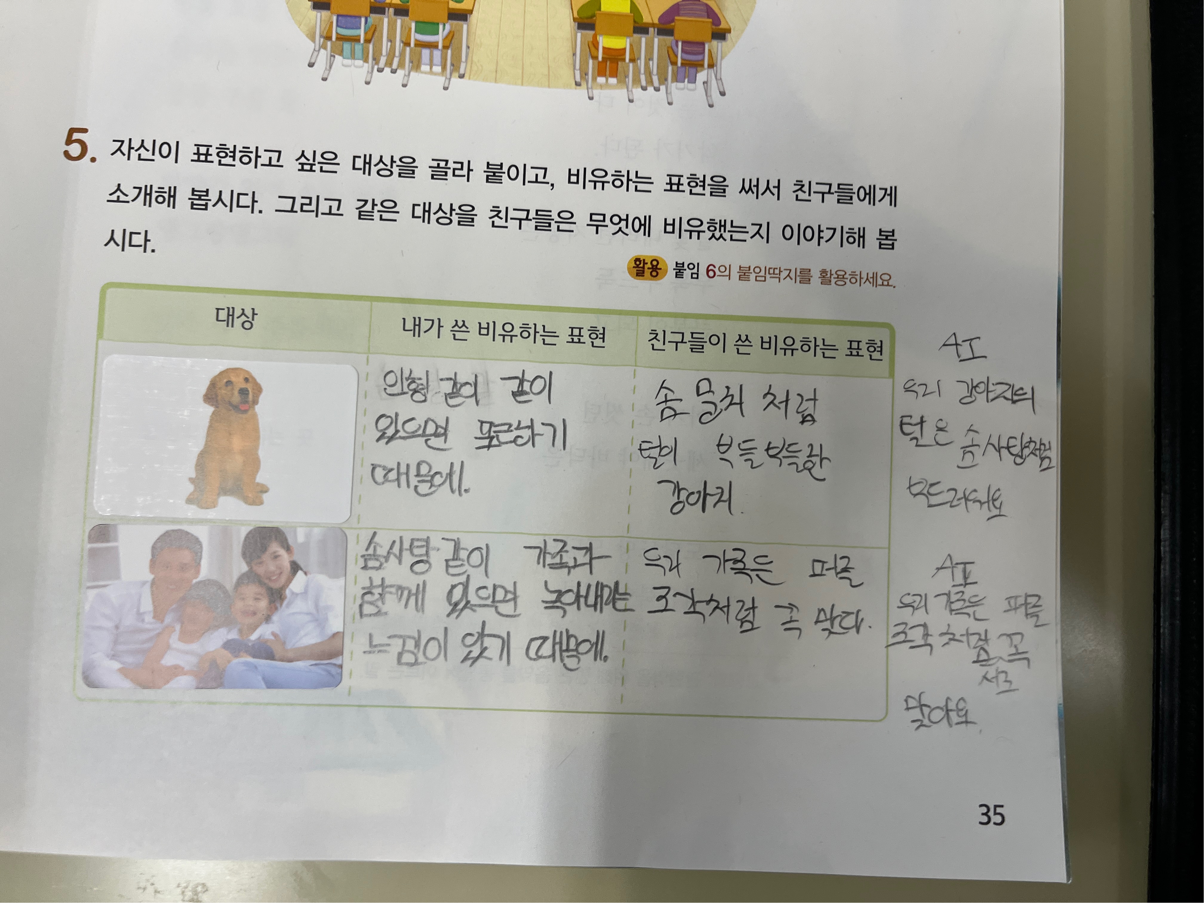 2. 자신이 비유 표현을 하고 싶은 대상 찾고, 비유하는 표현 적어보기(교과서 35쪽)