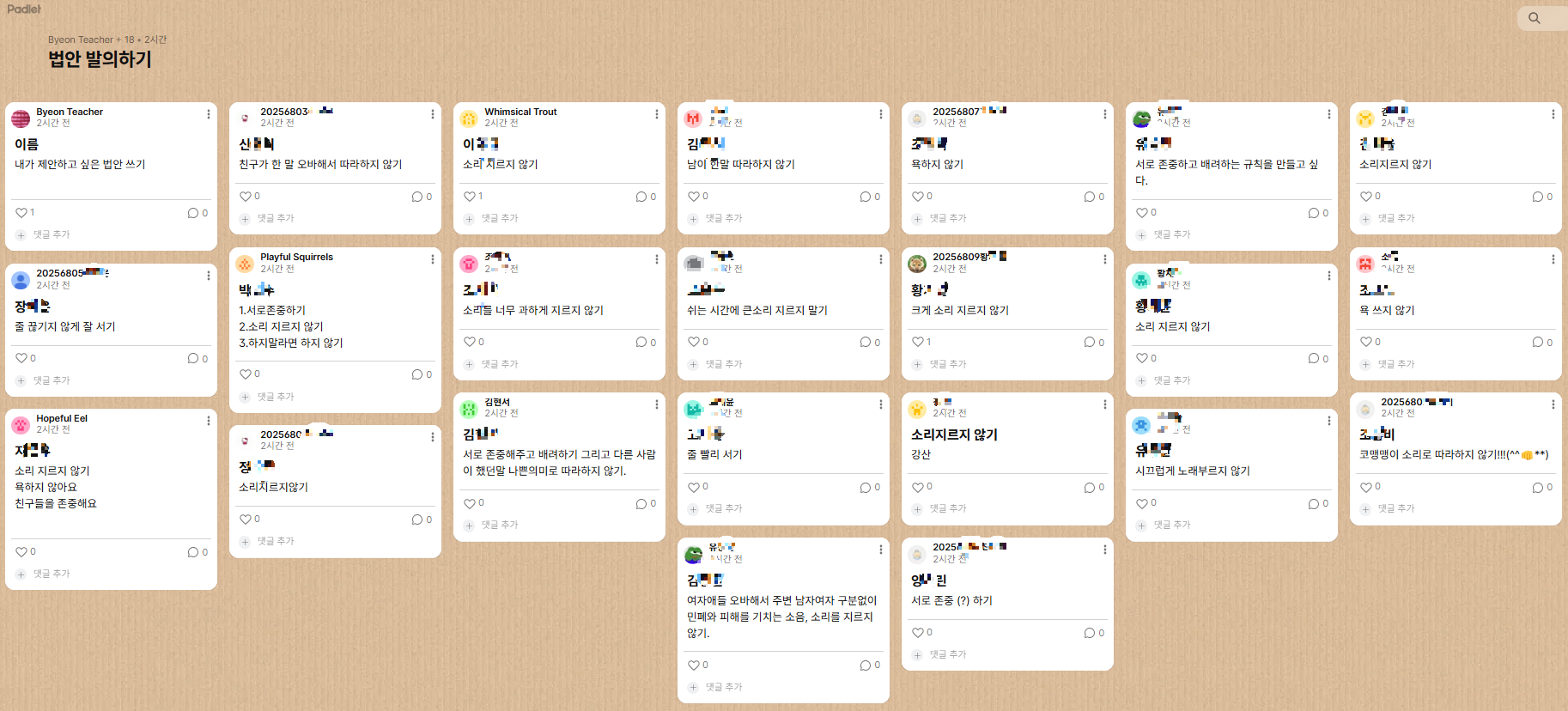 법안 발의라는 내용으로 학급 규칙을 제안해보도록 했는데, 아직은 서로에게 바라는 점을 적는 일차원적인 내용을 적어 주어서 다음 시간에 구체화해보려고 한다.
