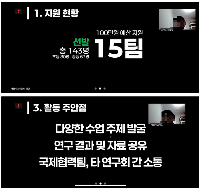 우리 연구회에는 올해 국제공동수업을 운영하는 선생님 3명, 이전 국제공동수업 운영을 해본 선생님 1명까지 해서 전체 연구회원 8명 중 4명(50%)가 국제공동수업 운영 중이거나 경험이 있는 점을 어필했다. 또 서울시 공식 국제공동수업은 아니나, 재외한국학교에서 주변 국제학교와 대면교류수업을 진행한 선생님도 계시다.