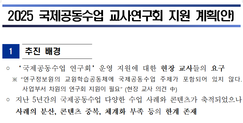 국제공동수업이 현재 서울시교육청에서 특색 사업으로 운영을 하고 있어서, 처음으로 연구회 지원까지 하게 된 것 같다. 또 이전의 운영 매뉴얼 속 운영 사례들을 살펴보면 문화 교류 수준에 그치는 교류로 끝나는 경우가 많아서 콘텐츠가 중복된다고 느끼곤 했었는데 이 부분을 정확히 짚은 배경을 함께 담고 있었다.