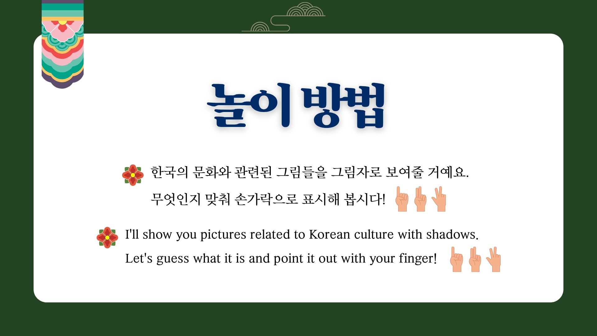 💡한국의 문화와 관련된 그림들을 그림자로 보여줄 거예요. 무엇인지 맞춰 손가락으로 표시해 봅시다! 1, 2, 3! I'll show you pictures related to Korean culture with shadows. Let's guess what it is and point it out with your finger! 1, 2, 3!