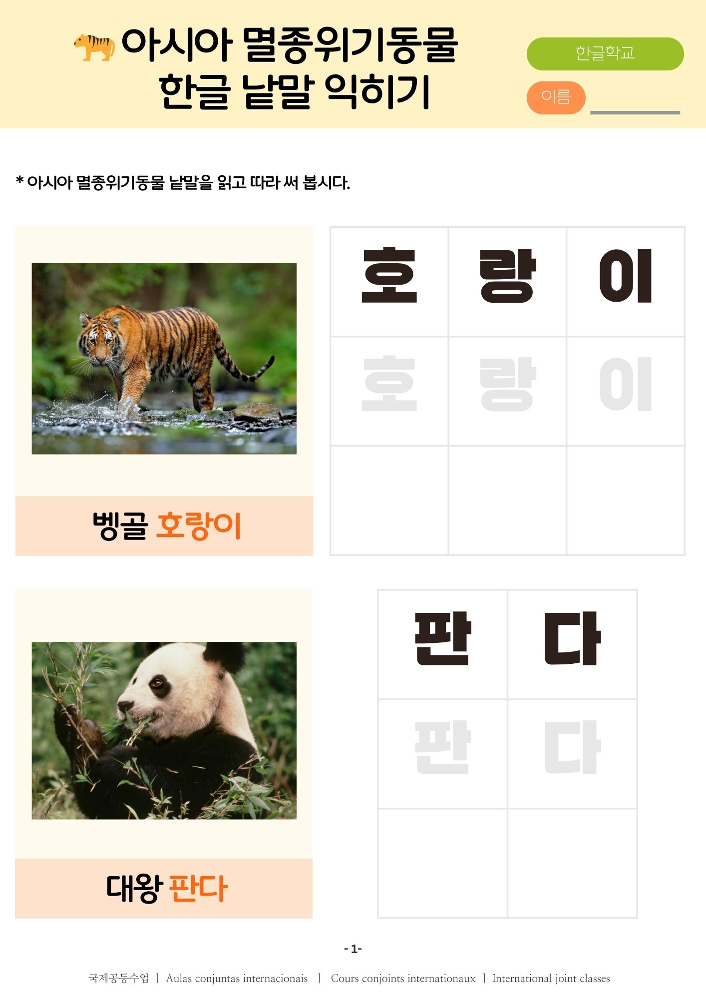 ♥️ 아시아 멸종위기동물 낱말 퀴즈를 풀고, 활동지에 단어를 읽고 써 봅시다. 세계의 멸종위기동물들을 익히며 세계시민의식을 길러 봅시다.