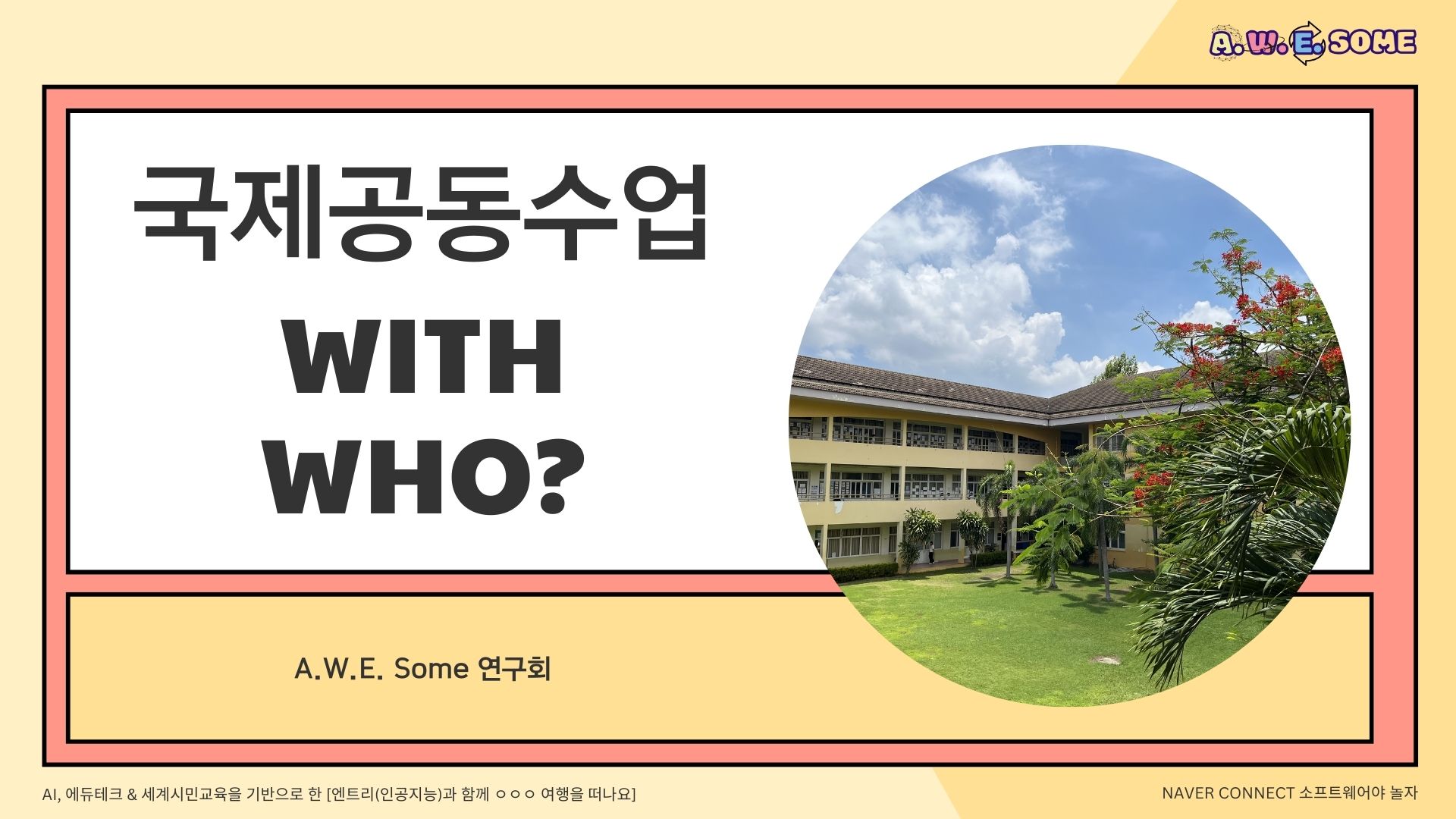 수업 사례를 나누기에 앞서 서울특별시교육청에서 운영하는 국제공동수업은 "아님"을 밝힌다. 네이버 티처스랩에서 진행하는 연구회에 참여하면서 자발적으로 교사들끼리 학교 간 교류 수업을 하는 프로그램을 개발하기 위해 연구회를 만든 것이지, 국제공동수업을 하는 것은 아니다. 다만, 교류 수업을 바탕으로 하고 있기는 하기 때문에 프로그램 내용에 국제공동수업을 운영하는 선생님이 참고할 만한 내용은 있을 것이다.