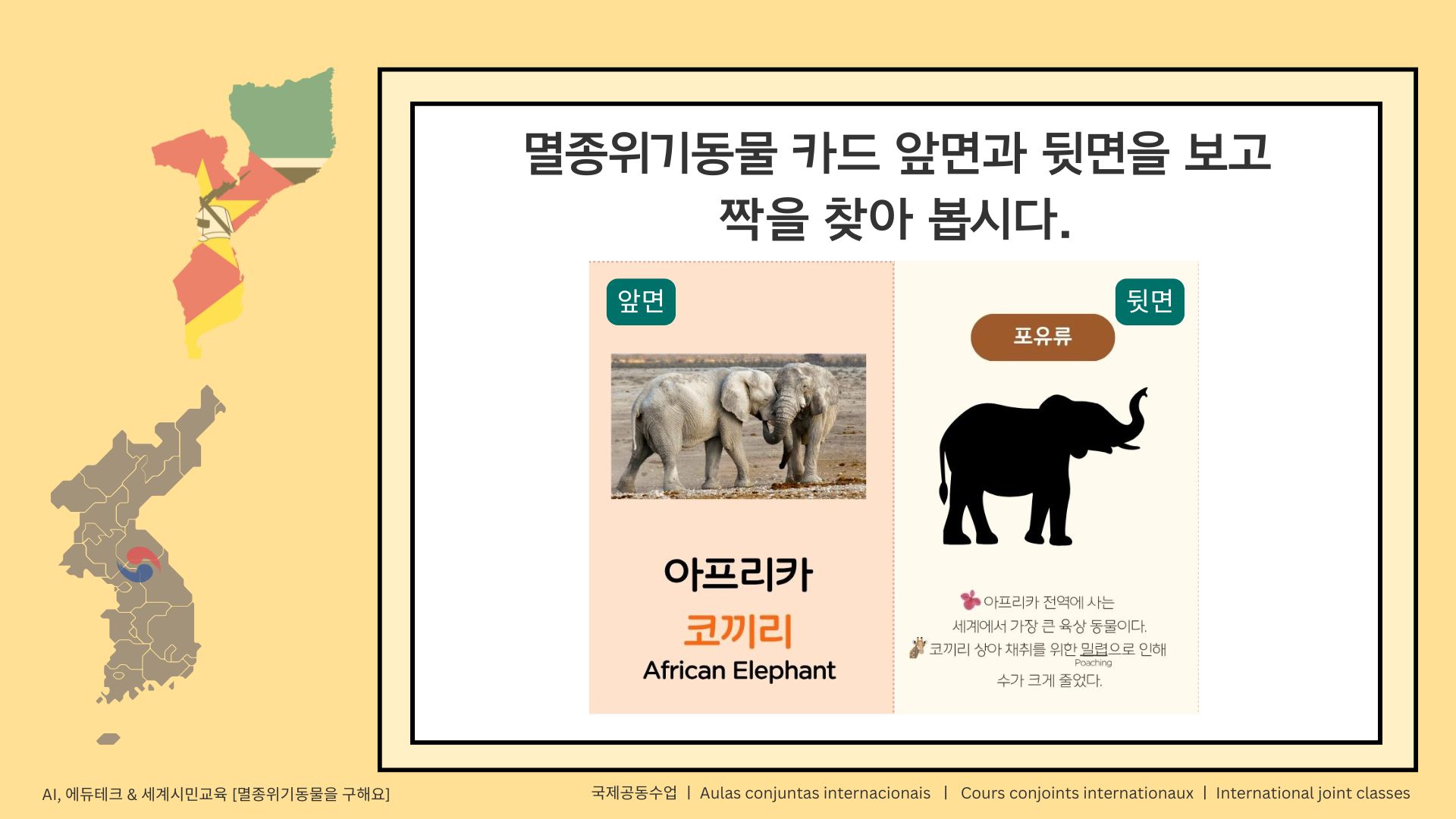 모잠비크(아프리카)의 한 국제학교와 함께 국제공동수업을 진행 중인데, 멸종위기동물을 주제로 수업을 하고 있다. 상대 학교는 1~4학년 학생들을 대상으로 하고 있고, 우리 학교는 6학년 학생들