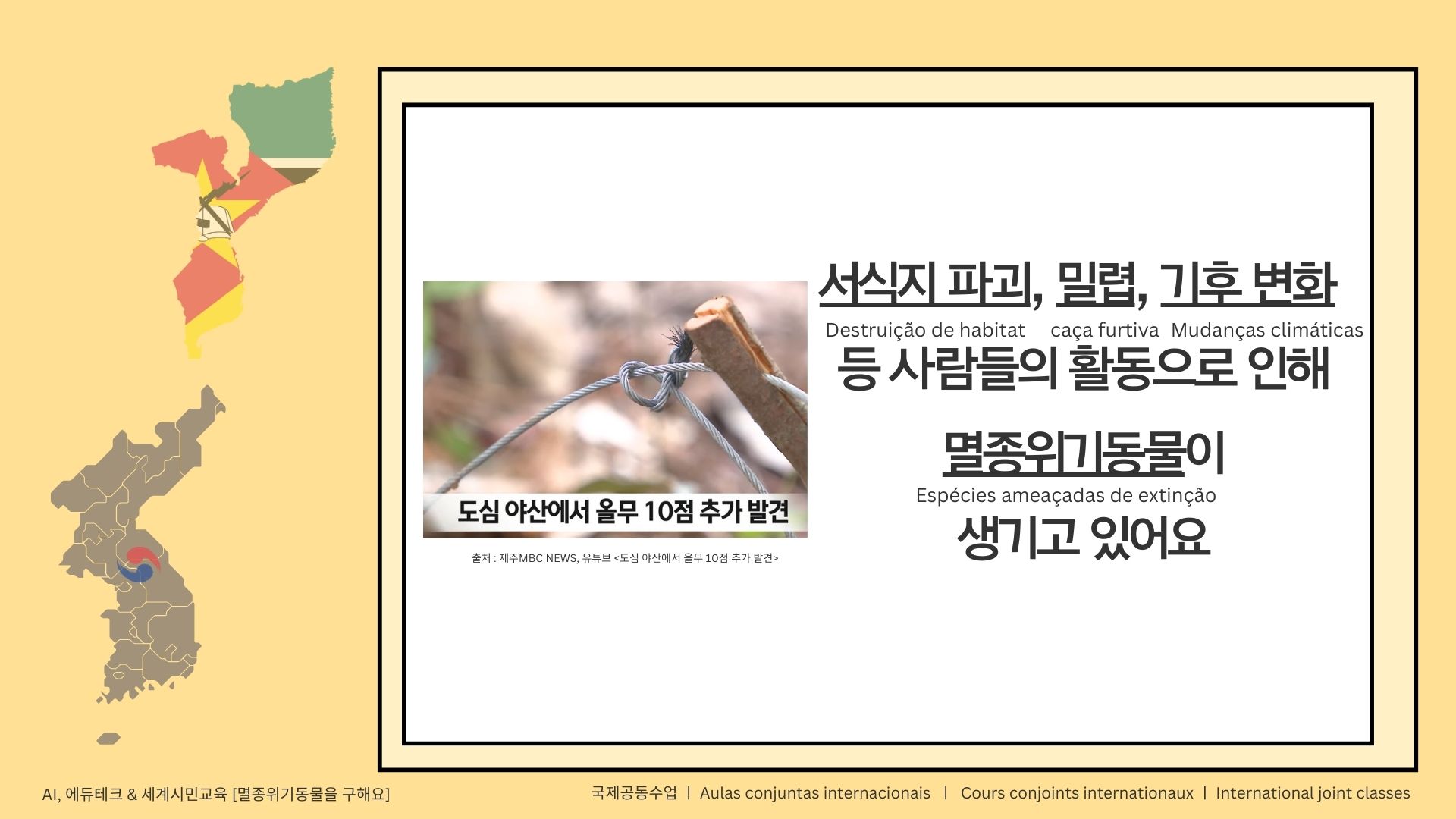 참고로, 모잠비크에 있는 학생들을 대상으로 한 PPT에는 뉴스 영상은 뺐다. 1~4학년 연령대이면서 한국어 초급 수준이기 때문에 뉴스 내용이 너무 어려울 것 같았기 때문이다. 그리고, 학생들이 서식지 파괴, 밀렵 이런 단어들을 한국어로 알지 못 할 것 같아 모잠비크의 공용어인, 포루투갈 언어로도 단어 뜻을 적어두었다. 또, 뉴스 영상 대신 아래의 영상을 통해 '멸종 위기'의 의미에 대해 알아보는 영상을 시청하도록 했다.