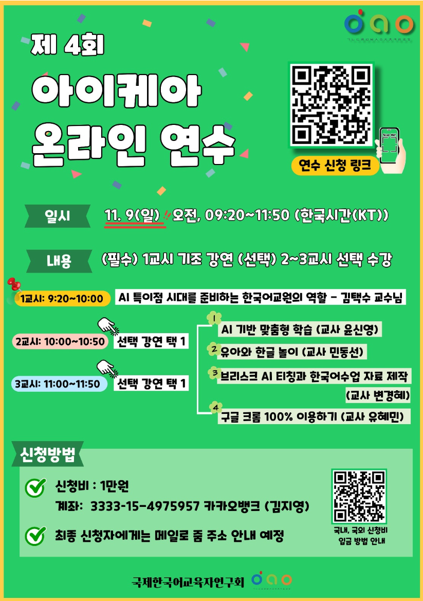 📣 국제한국어교육자연구회(아이케아)에서 교육에 꼭 필요한 다양한 강좌를 준비했습니다. 연간구독을 신청한 선생님들은 무료, 일반 회원분들은 1만원의 참가비를 받습니다. 노쇼가 되지 않