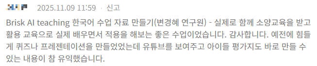 대상 선생님들은 세계 각자의 한글학교 선생님이신 경우가 많은데, 한국어 교육 자료 제작에 도움이 될 수 있을만한 툴로 브리스크 티칭 AI를 소개하고, 수업 자료 제작에 직접 적용하는 체험형 실습 연수로 준비를 했다. 그리고 캔바AI로 매칭 단어 퀴즈 만들기도 시간이 남으면 시연으로 간단하게 보여드리고자 준비를 했었다.