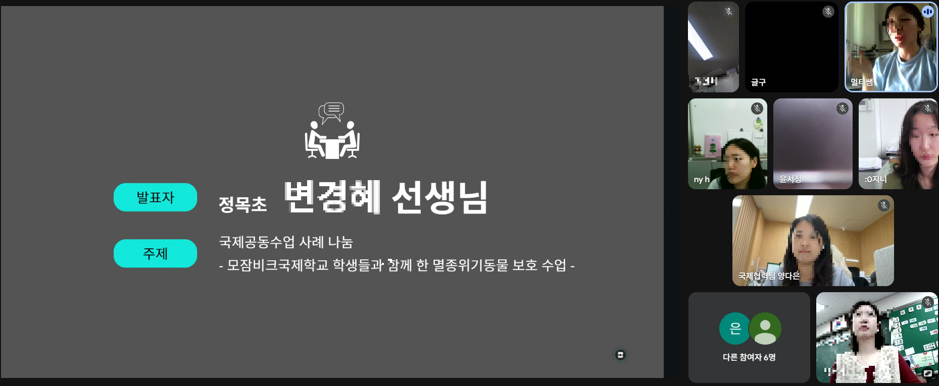| 국제공동수업 l 2차시 : 아시아에 사는 멸종위기동물을 알고 멸종위기동물이 생기는 이유를 탐구하기 (5) | 2025.08.17 |