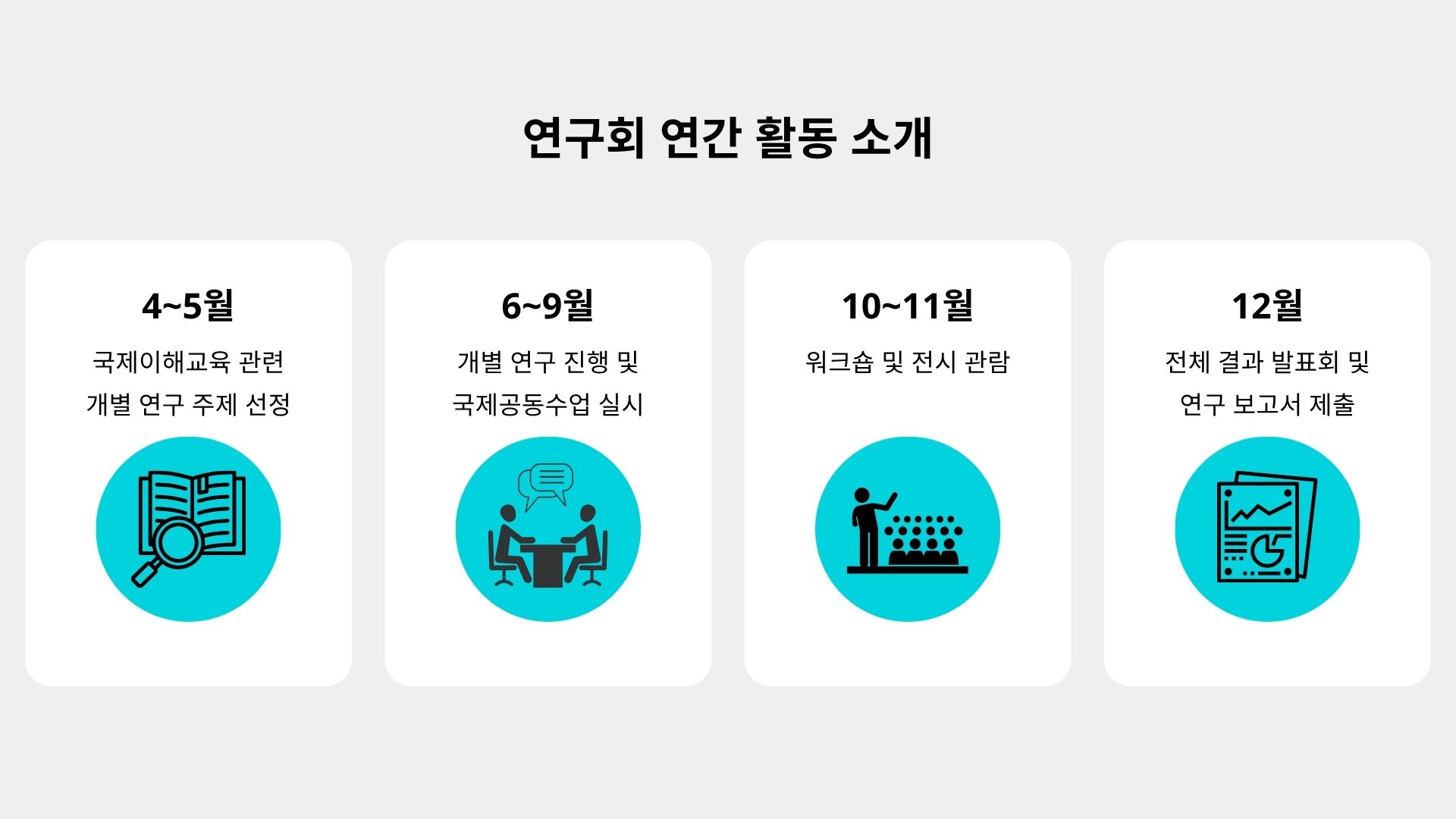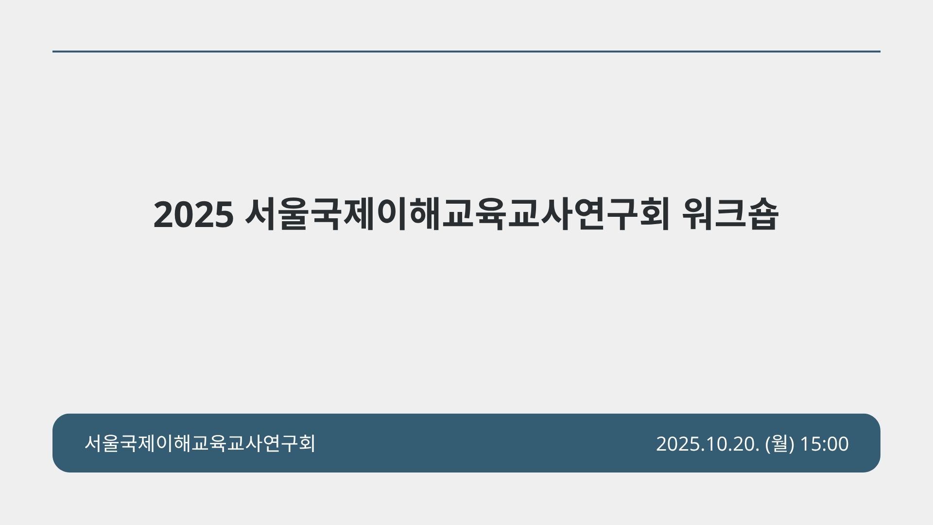 올해 서울특별시교육청에서 국제공동수업 교사연구회 '서울국제이해교육교사연구회'를 운영하고 있어 하반기에 워크숍 개최했다. 주제는 국제공동수업 수업 사례 나눔 및 연구 발표 나눔이었다.