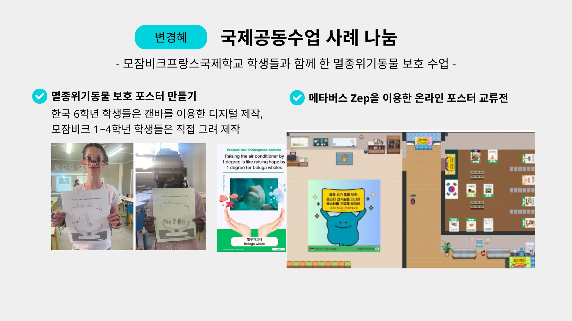 | 국제공동수업 l 4차시: 멸종위기동물 보호 포스터 만들고 국제 교류 전시회 열기(feat. Zep 젭, 매직스쿨 AI) (13) | 2025.06.18 |