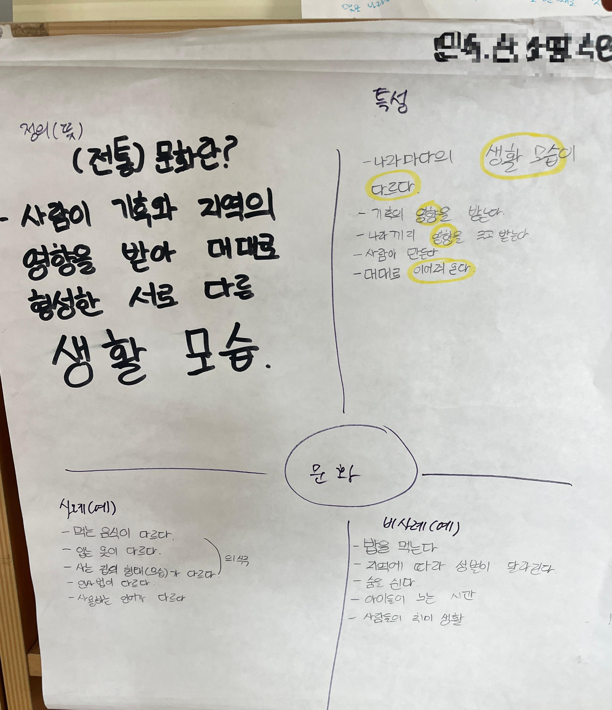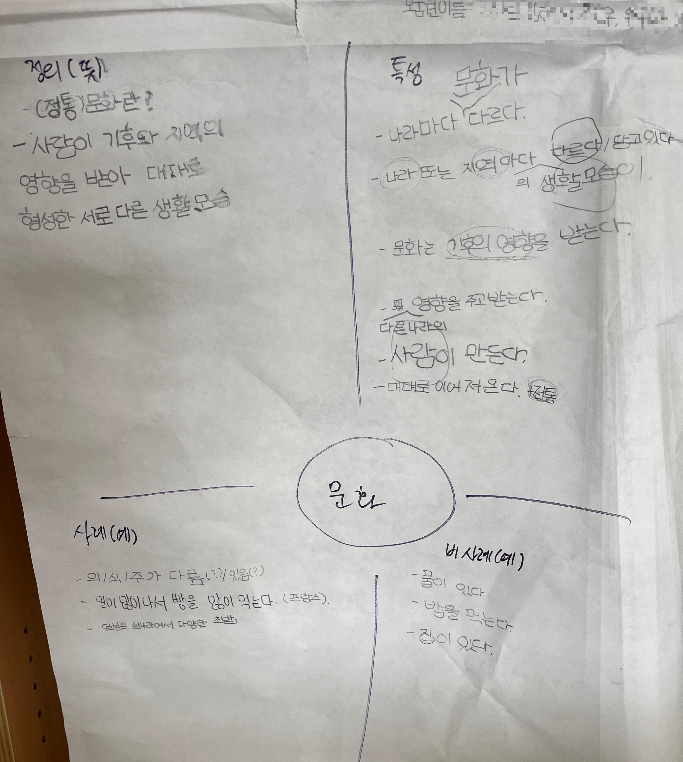 학생들과 함께 문화에 대해 정의를 내려보았는데, 우리가 IB수업에서 다루는 문화는 자연환경에 영향을 받은 문화를 다루기 때문에, 비교적 '문화' 자체보다는 '전통 문화'에 조금 더 가깝다는 것이 결론이었다. 이에 전통 문화를 떠올리면서 프라이어 모델로 정의를 내려보았다.