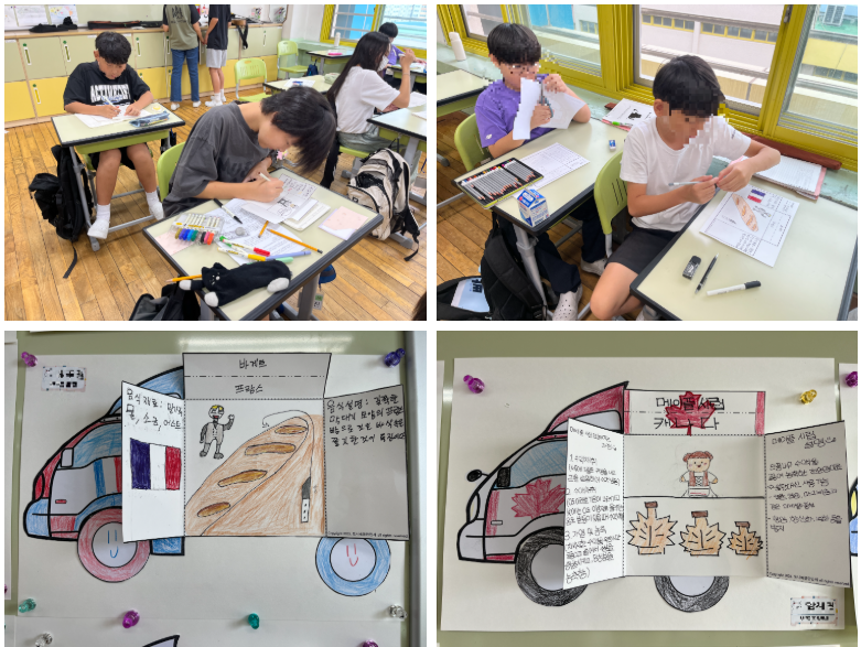 세계 여러 나라의 음식을 소개하는 푸드 트럭 만들기 활동을 실시했다. 푸드 트럭 양식과 아이디어는 모두 초등교사 자료 공유 플랫폼인 인*스쿨의 한 선생님이 올려주신 자료를 활용했다. 단, 음식 설명에는 재료 설명을 하며 환경적 요인에 대한 설명을 넣을 수 있는 부분이 있으면 함께 적도록 안내했다.