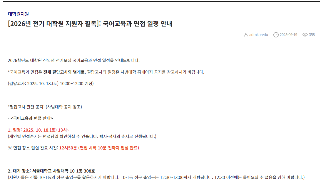 (한)국어교육과는 같은 공간에서 시험을 보았고, 지필이 오전, 면접이 오후에 진행되는 식으로 진행되었다. 지필은 석박사 모두 한꺼번에 시험보되, 시험지를 따로 배부하였고, 면접은 박사 먼저 실시한 후, 석사를 실시했다.