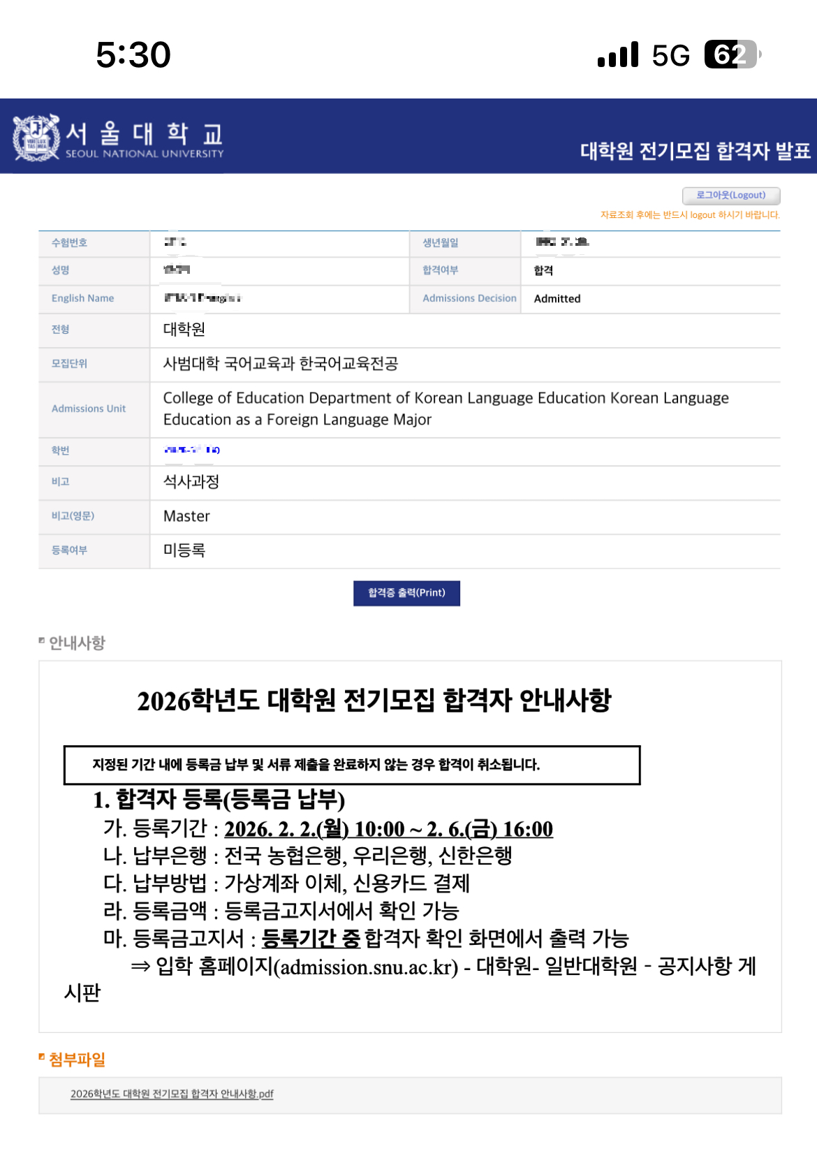 합격자 발표는 발표 예정일 18시 이후에 난다고 되어 있는데 17시 30분에 확인했을 때도 확인이 가능했다. 모바일로도 확인이 가능했다.