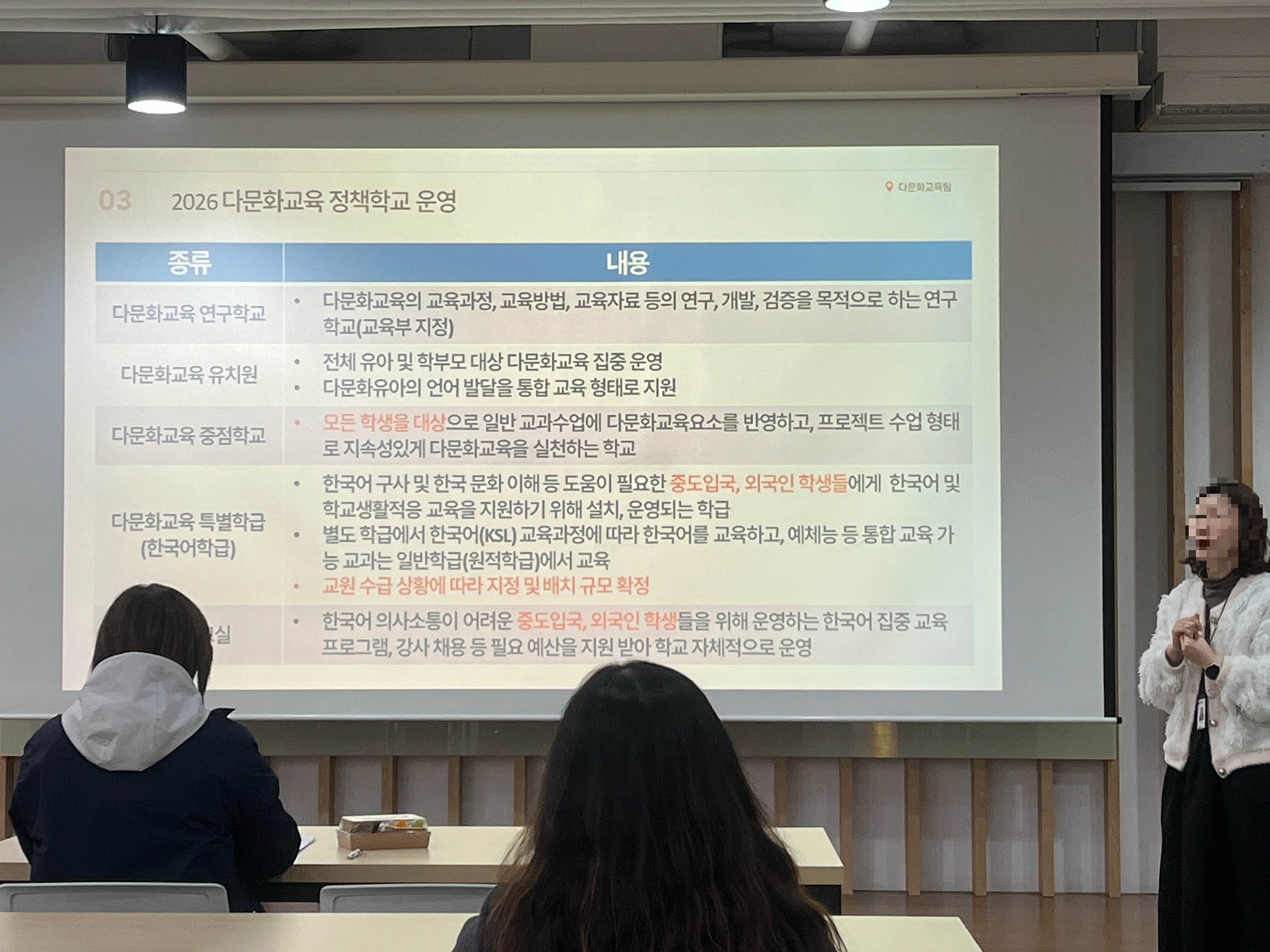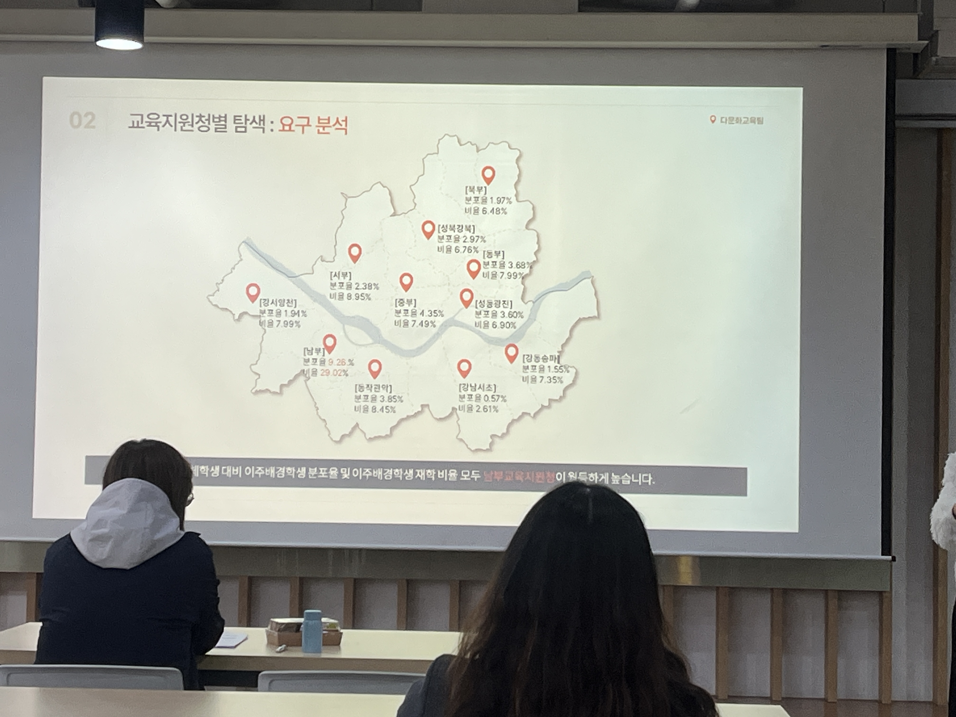 나도 한국어학급이 있는 학교에 관심이 많았는데 장학사님께서 강연 전에 다문화교육 정책학교, 강서양천교육청의 실태 등에 대해 전반적으로 설명해주셨다. 전체학생 대비 이주배경학생 분포율로 보았을 때 강서양천은 분표율이 1.94%로, 분표율이 9.26%인 남부교육청에 비해서는 월등하게 적은 편이다. 하지만 다문화교육이라는 것이 이주배경학생만을 대상으로 하는 교육이 아니라 전체 학생을 대상으로 실시해야 하고, 우리 사회 전체에 대한 인식과 관련된 것이라고 생각했기 때문에 그 필요성은 크다고 생각했다.