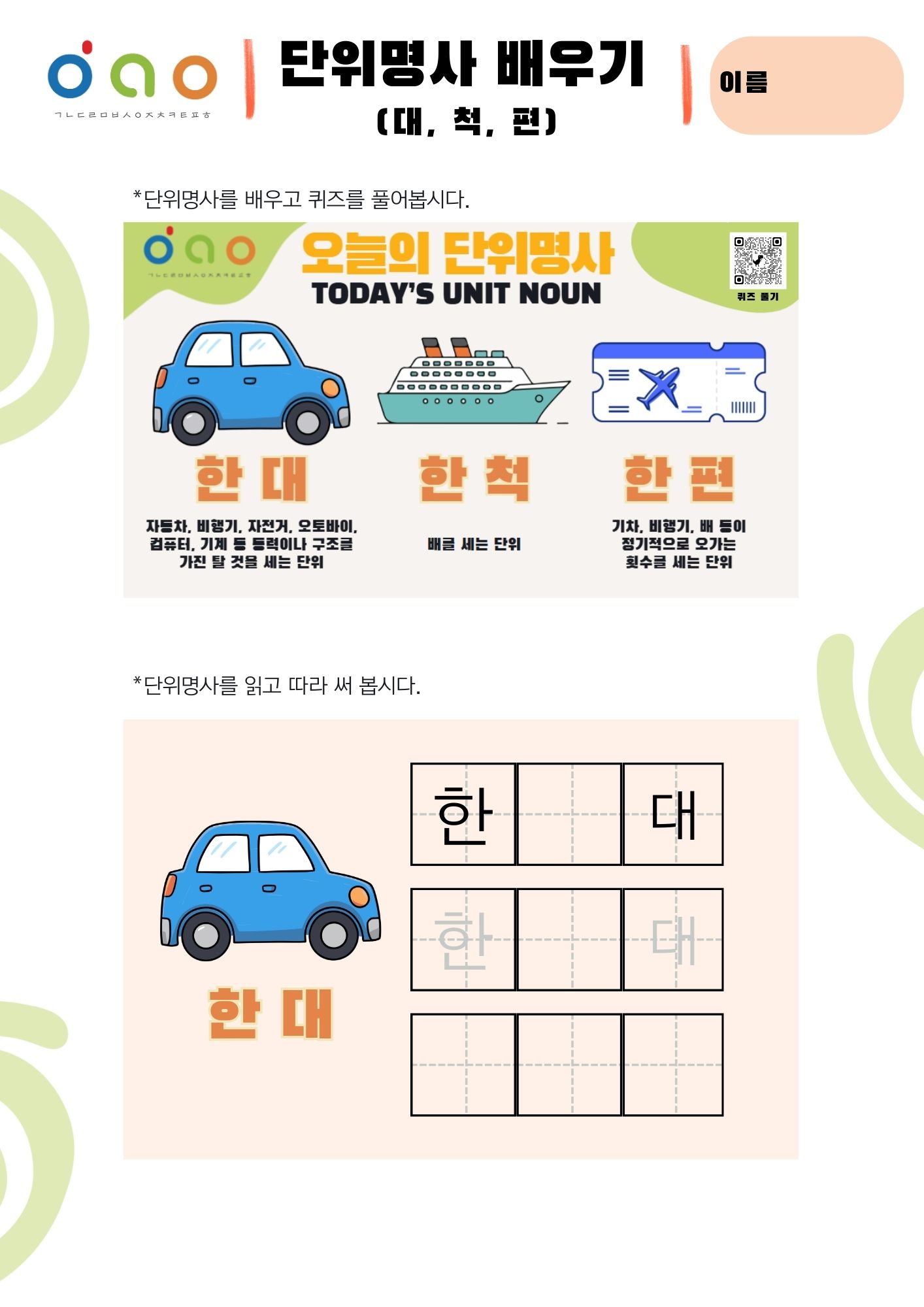 ♥️ 단위명사 대, 척 편을 배워 퀴즈를 풀고, 활동지를 활용해 배운 단어를 읽고 써 봅시다.