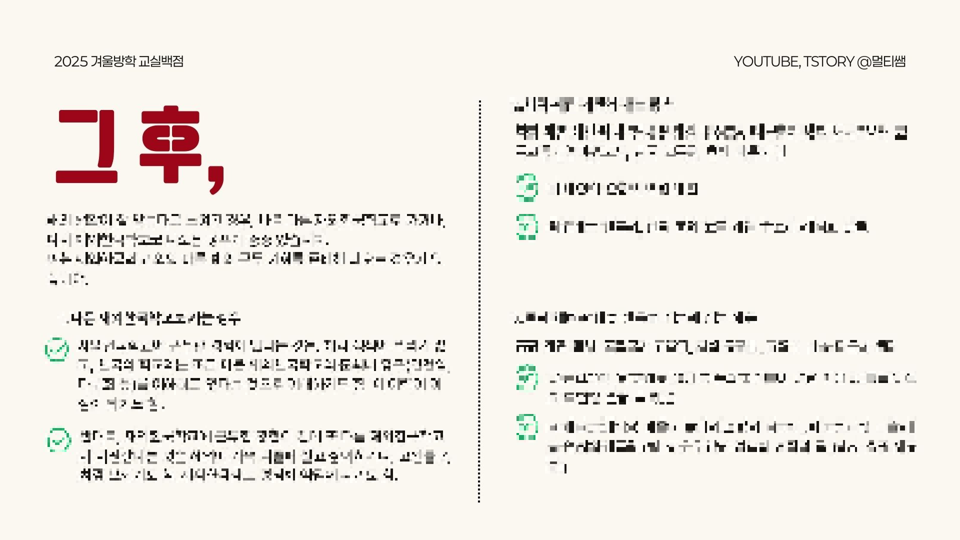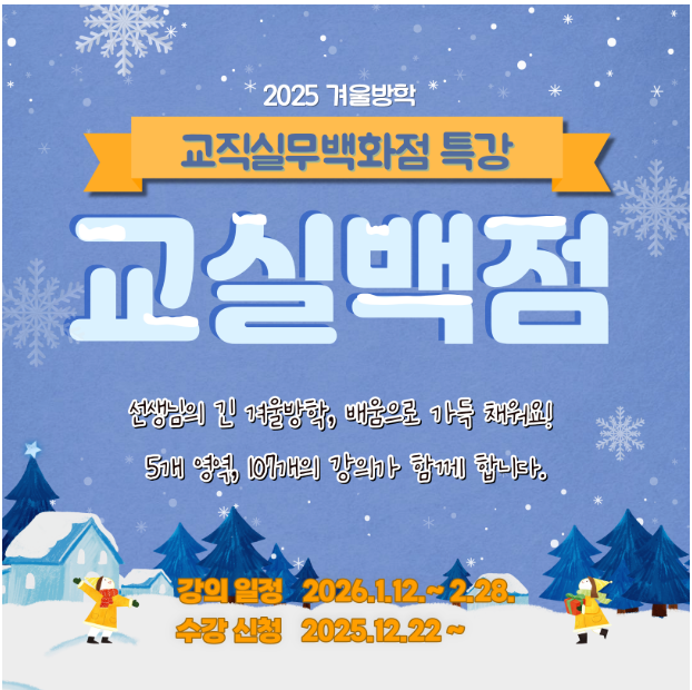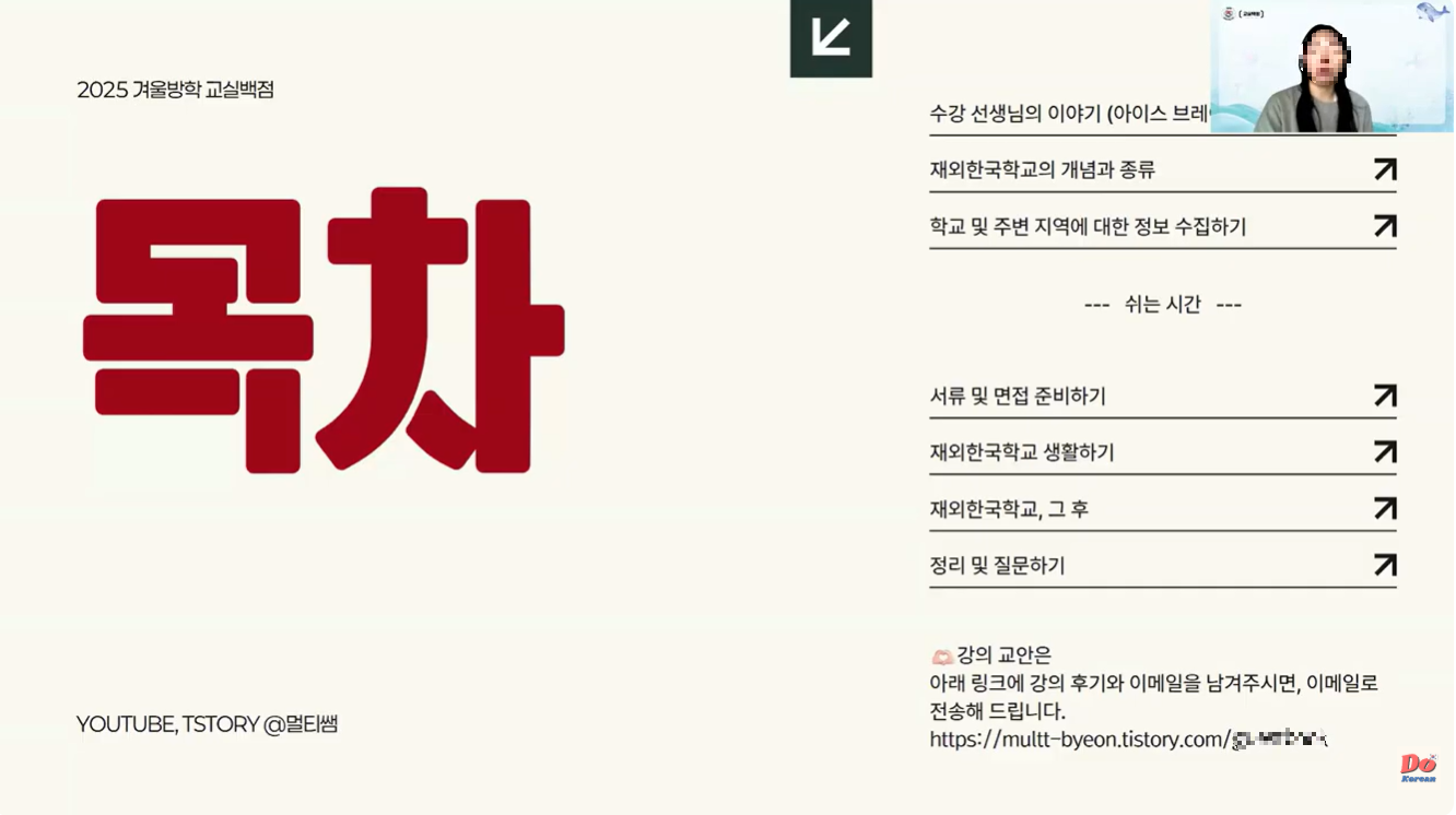 이번 겨울 방학에 담임톡과 교크협에서 함께 주최하여 학급경영, 수업, 자기계발, 업무효율화, 생활지도&교권, 이 다섯 영역으로 107개의 강의를 연다. 나도 이번 교실백점 강의에서 '저경력 교사의 재외한국학교 지원부터 생활까지 파헤치기'를 주제로 강의를 하게 되었다.
