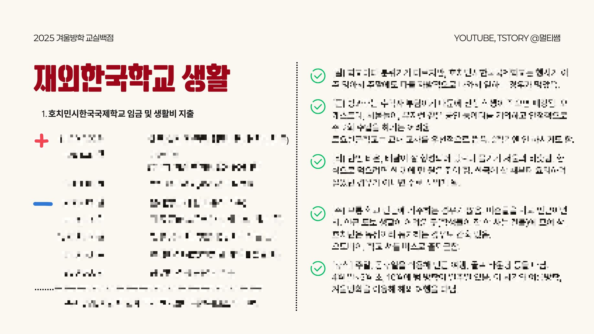 가장 궁금했을, 대략적인 임금과 지출 생활비 내역을 공유해드렸다. 타이베이한국학교는 임용 전, 시간강사로 간 것이었고, 호치민시한국국제학교는 발령 후, 초빙으로 간 것이었기 때문에 임금이 크게 차이났다. 그리고 근무하면서 방과후수업, 한글학교의 기회나 부수입에 대한 내용들도 대략적으로 공유드렸다.