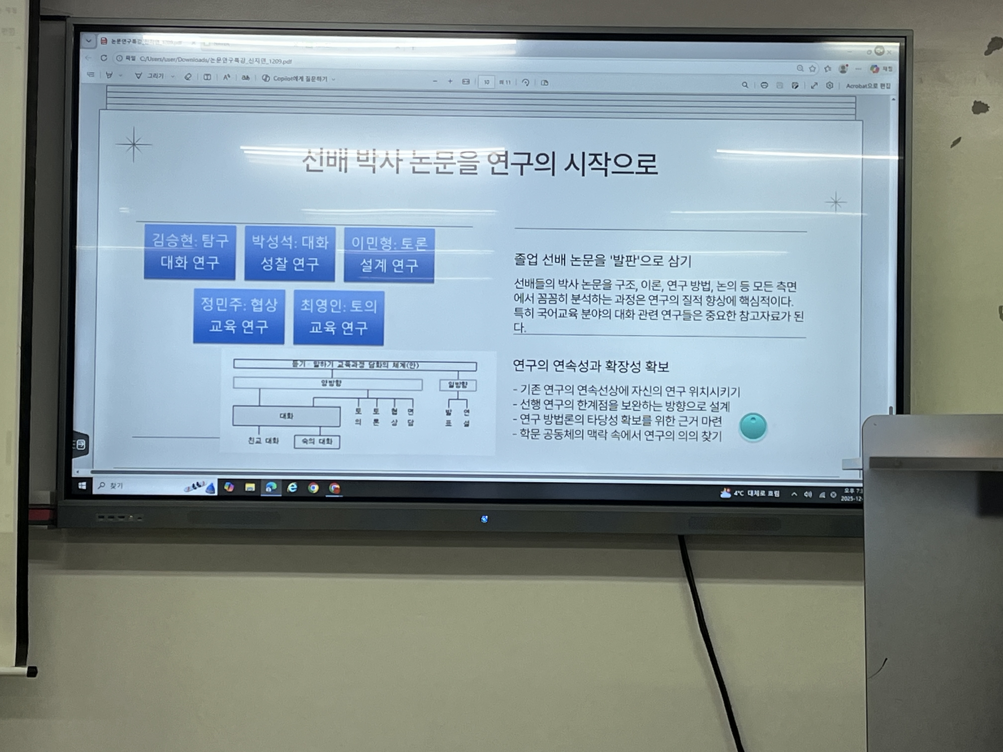 지난 12월 9일에는 국어교육과 선배의 졸업 논문 소개와 연구 과정을 발표하는 시간을 가졌다.